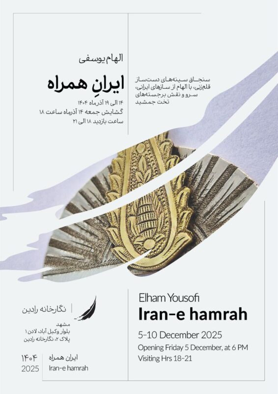 این نمایشگاه از تاریخ ۱۴ الی ۱۹ آذرماه ۱۴۰۴ در محل نگارخانه رادین مشهد واقع در بلوار وکیل آباد، برگزار شد. بازدید از نمایشگاه سنجاق سینه های دست ساز سرکار خانم الهام یوسفی که حقیقتا ۹ ماه تلاش بی وقفه ایشان، گنجینه ای از آثار بی نظیر قلم زنی را در خود جای داده بود، سبب شگفتی و خوشنودی است. در دنیایی که همه چیز تکراری، بی هویت و مصنوعی شده است، حتی تماشای آثار هنری، روح و جسم انسان را تلطیف می کند.